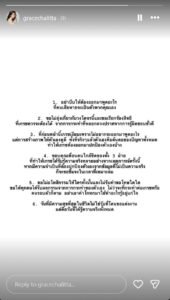 หลังจากที่ฝ่ายชายออกมาโพสต์ขอโทษและระบุว่าเป็นคนยุติความสัมพันธ์เองเนื่องจากปัญหาส่วนตัว ทางด้านเกรซก็ได้ออกมาตอกกลับด้วยเนื้อหาที่ทำเอาชาวเน็ตถึงกับตาสว่าง ดังนี้: